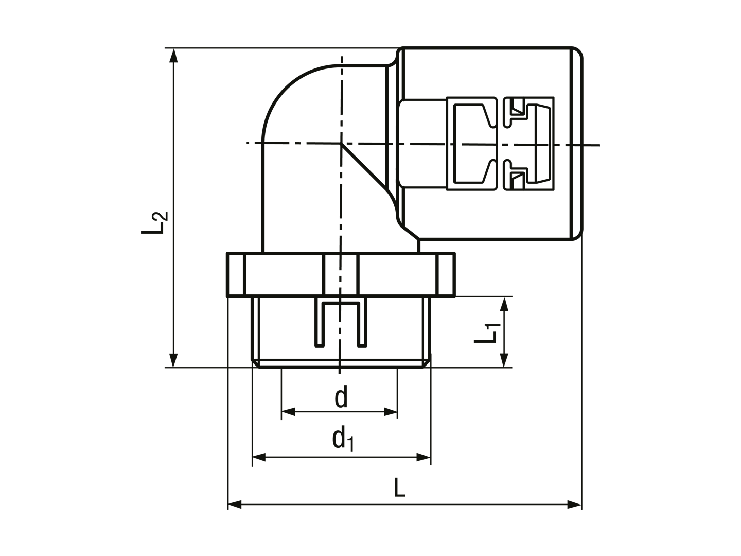 DescriptionProduct featuresWith metric connecting thread Additional information90° elbow can be turned in any direction, without additional nut.Variants