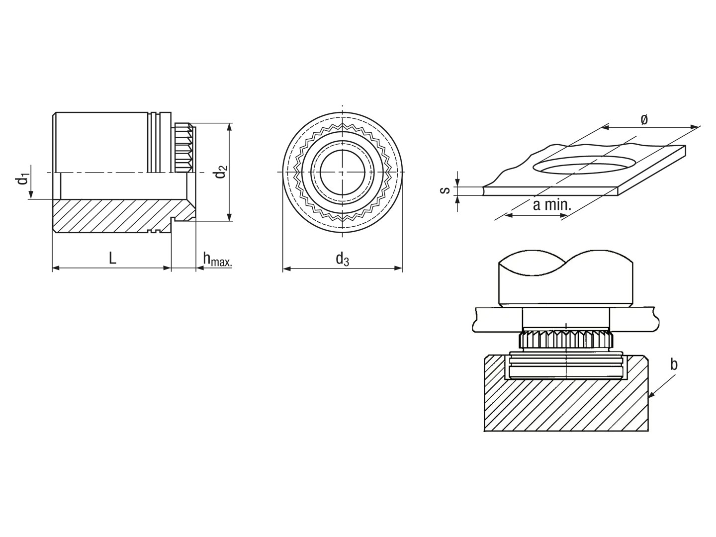 Broaching standoffs with through-hole, inch-version, for PC boards and other plastics