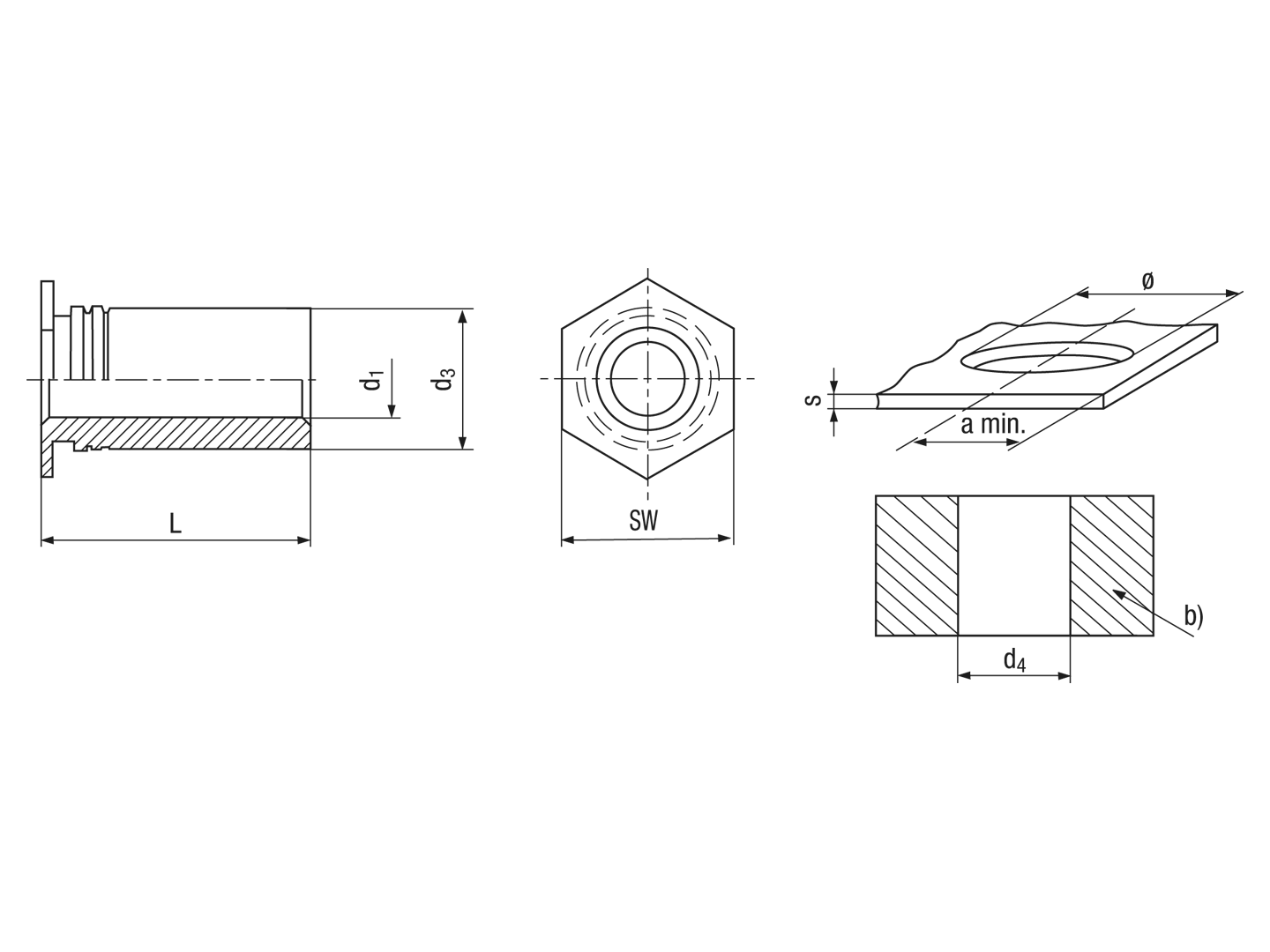 Broaching standoffs with thru-hole, inch-version, for metallic materials