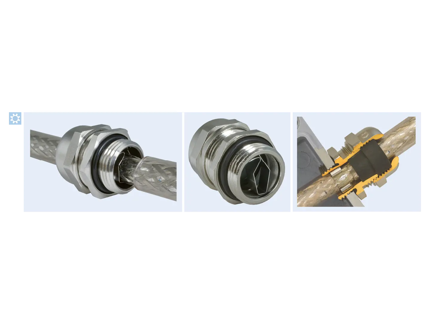 - Quick and easy EMC connection of the cable shield via the contacting spring with the gland body and the housing potential