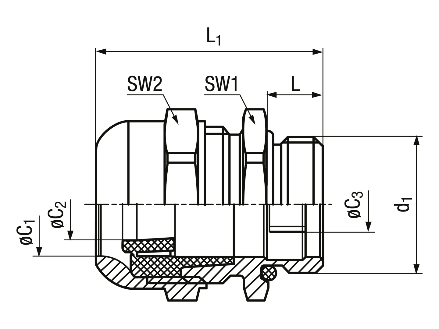 - Gland body: brass CuZn39Pb3, nickel-plated