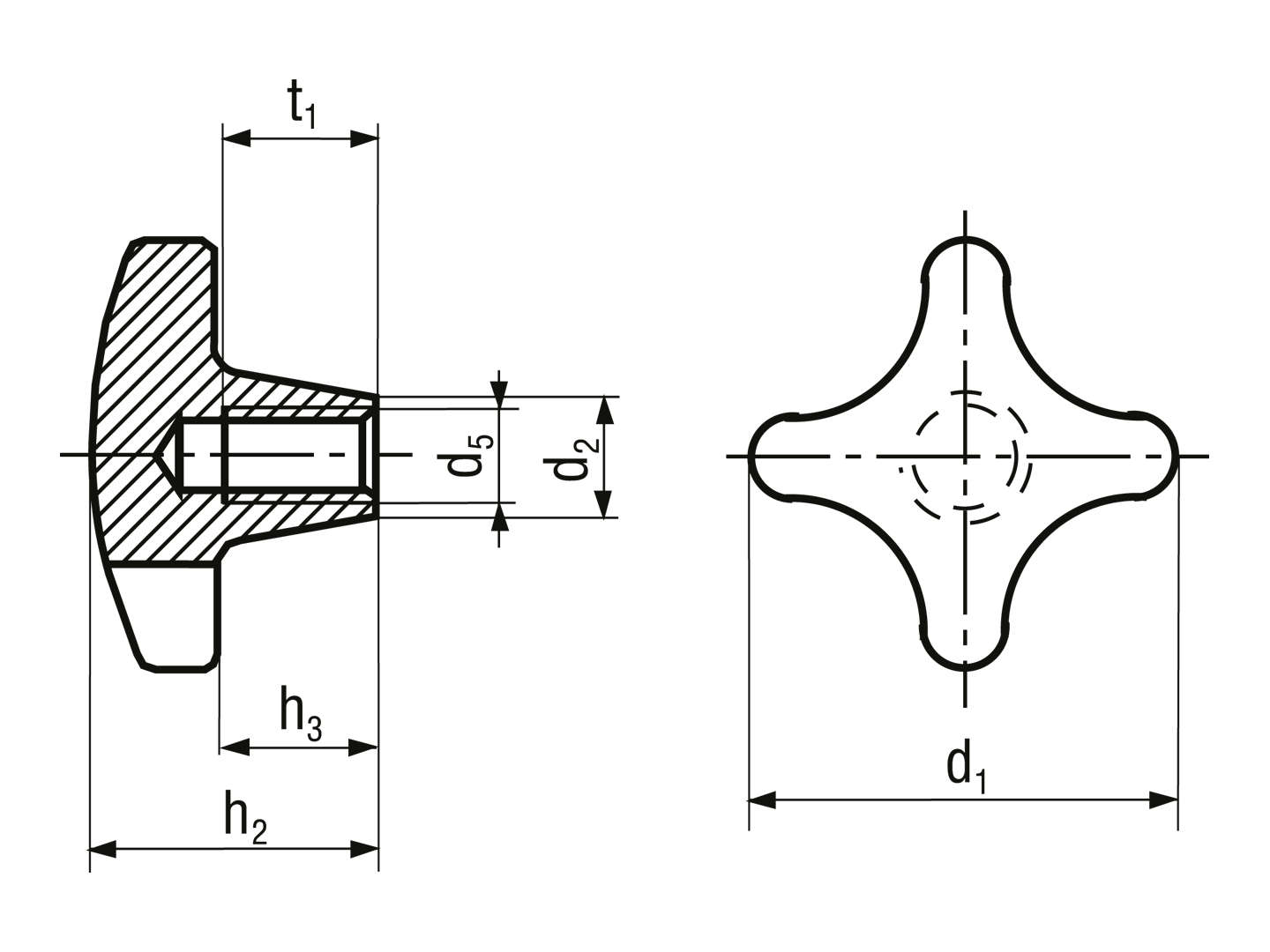 Star knobs nodular cast iron, deburred and sandblasted DIN 6335 E with tapped blind hole
