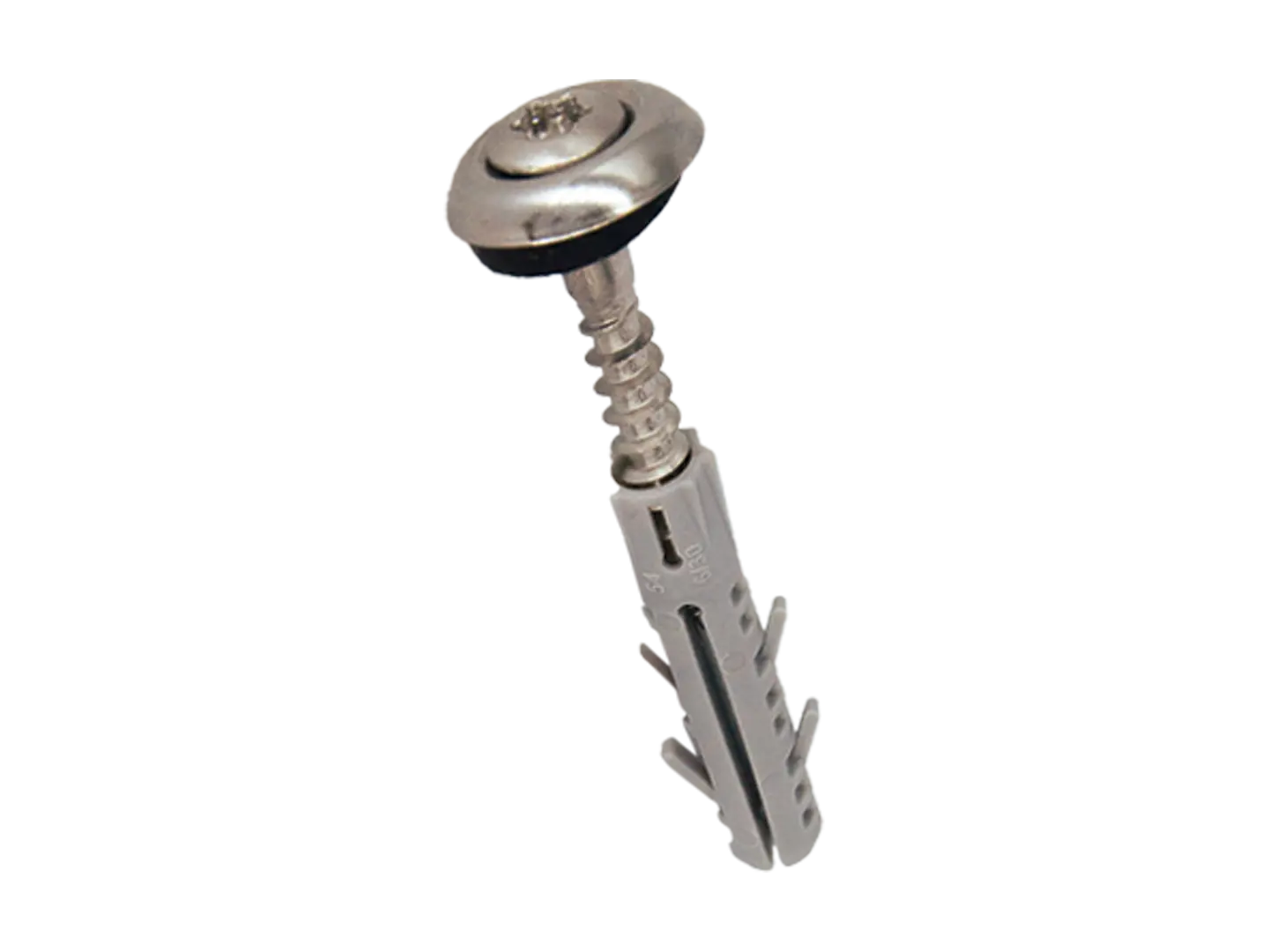Hexalobular (6 Lob) socket oval countersunk head building screws with slot, assembled with finishing washer and sealing ring with pre-mounted nylon plug