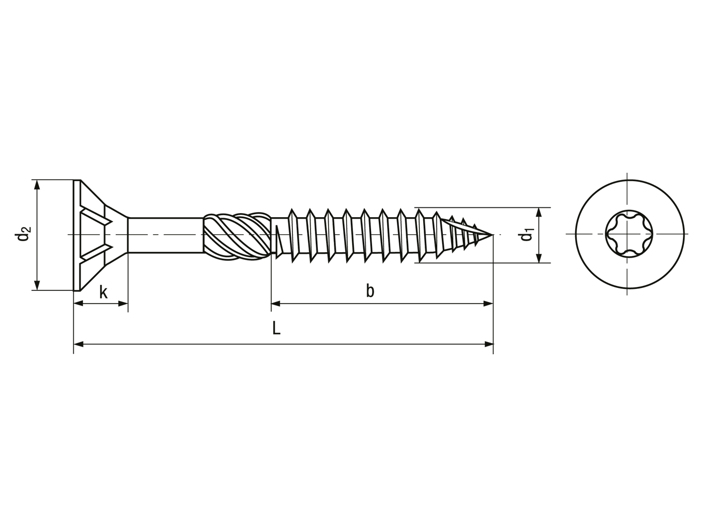 Universal hexalobular (6 Lobe) socket flat countersunk head wood screws partially threaded, cutting ribs under the head, friction thread, end mill cutter