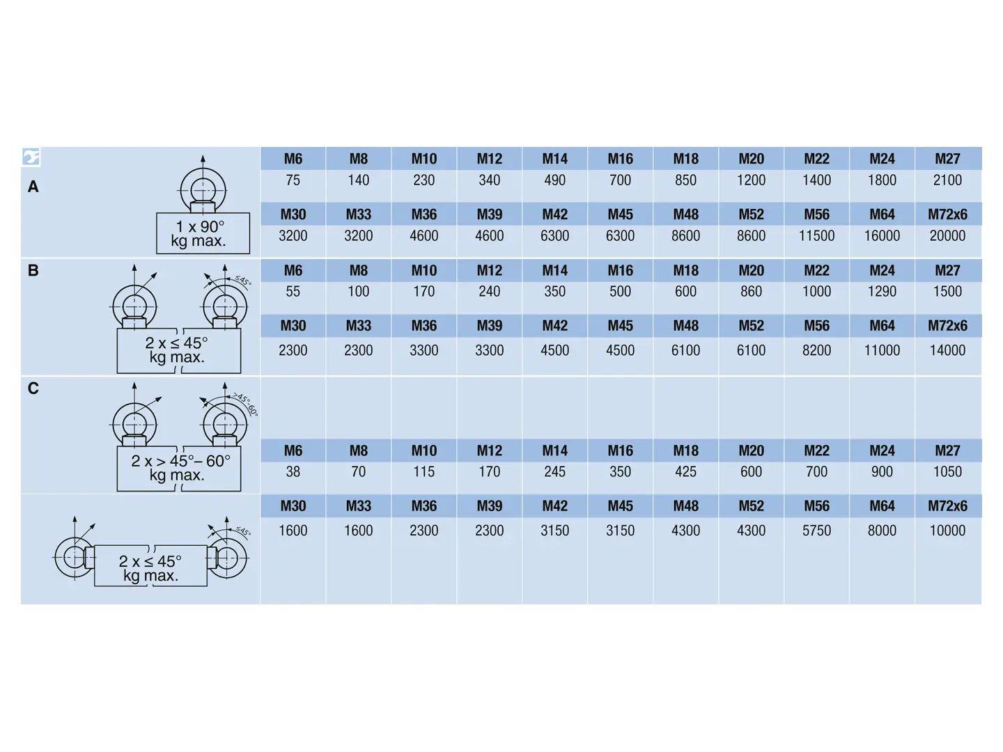 Taking into account a safety factor in relation to the minimum breaking force according to the standard, lifting eye bolts have the load capacities (kg) specified in the table for single-strand fastening.
