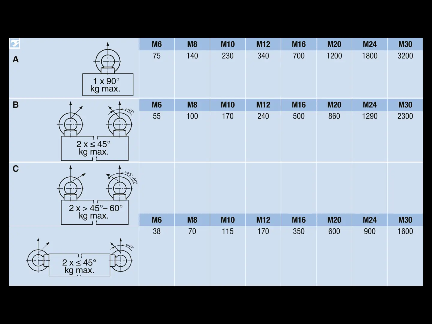 Taking into account a safety factor in relation to the minimum breaking force according to the standard, lifting eye bolts have the load capacities (kg) specified in the table for single-strand fastening.