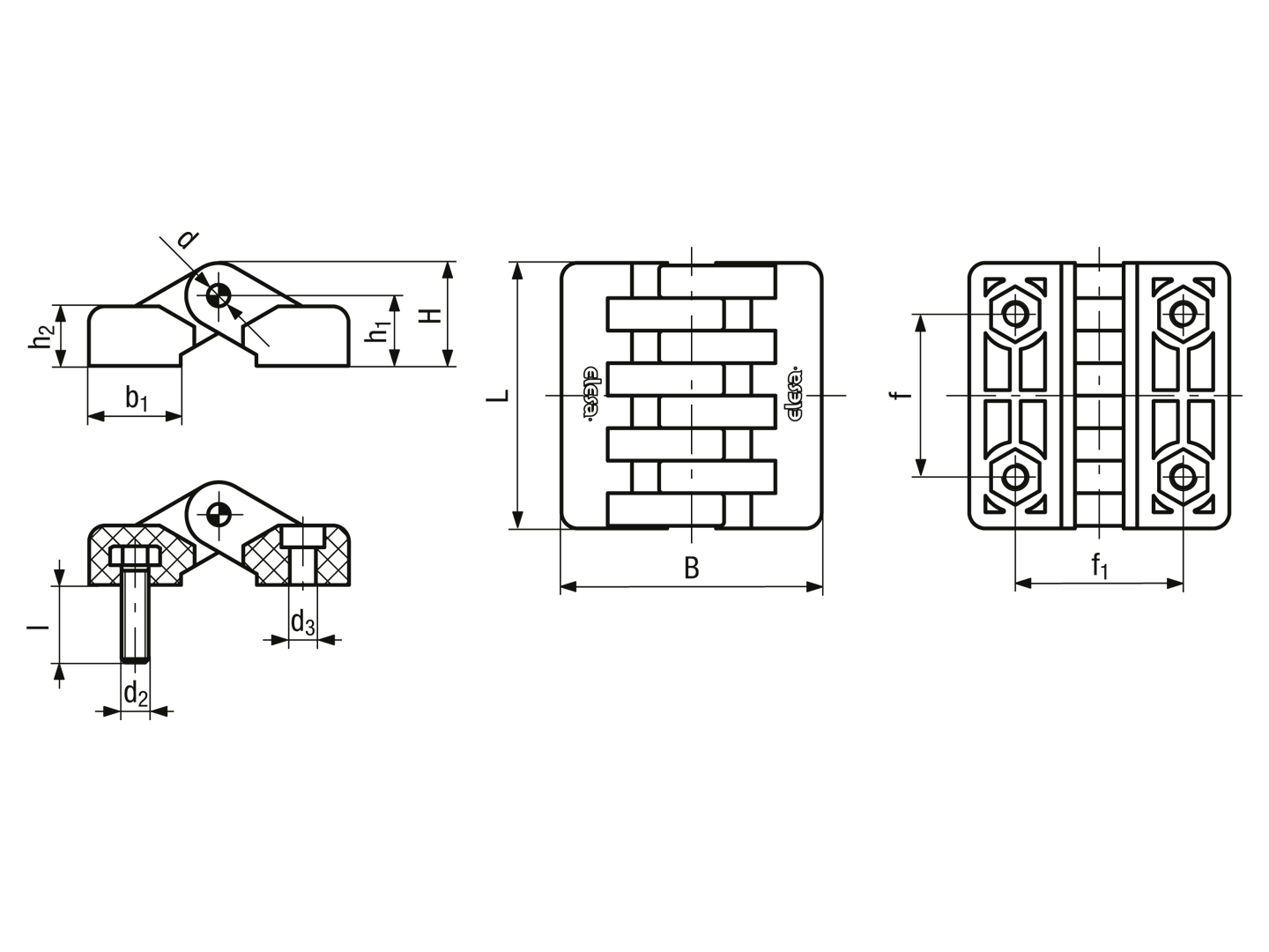Hinges with threaded studs, steel nickel plated and pass-through holes for cylindrical head screws