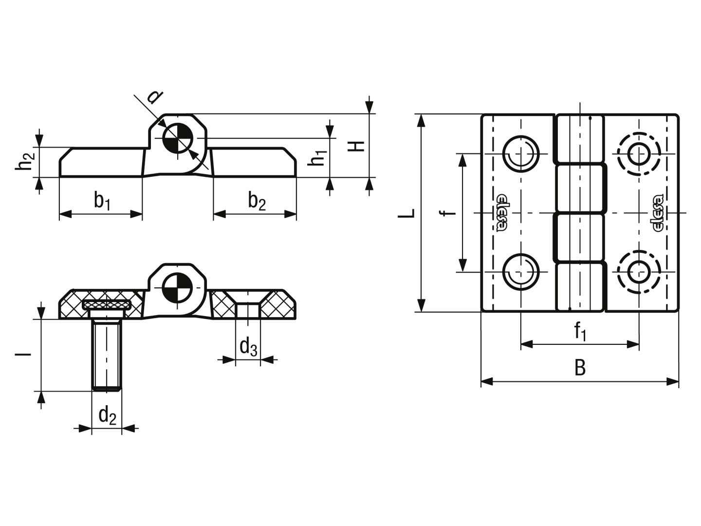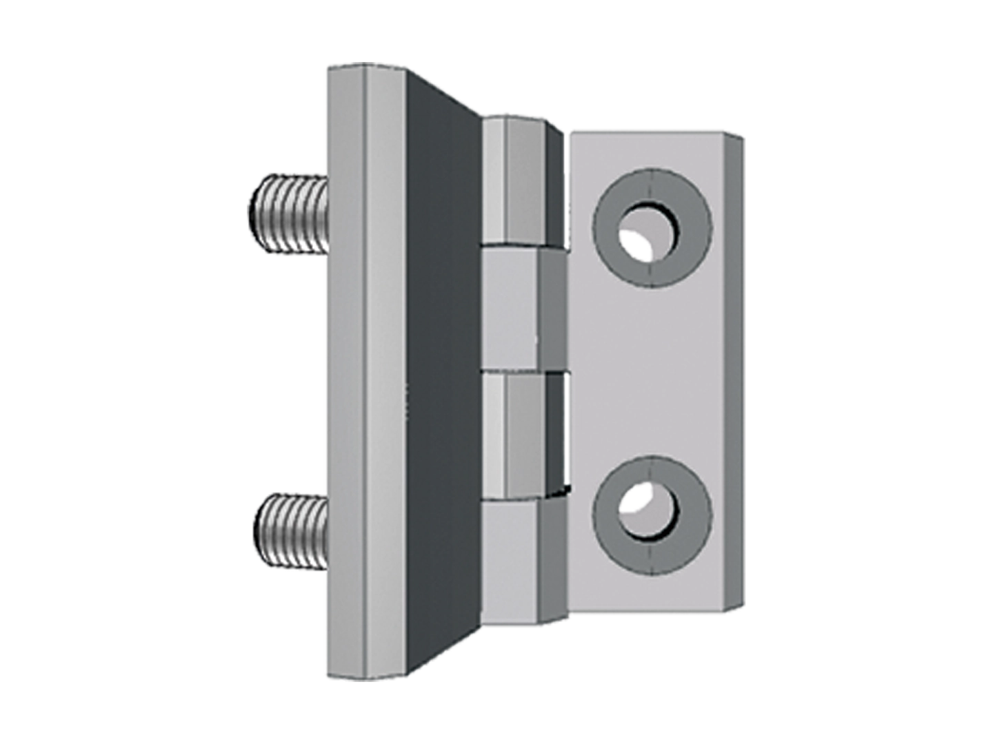 Hinges with threaded studs, steel nickel plated and pass-through holes for countersunk head screws