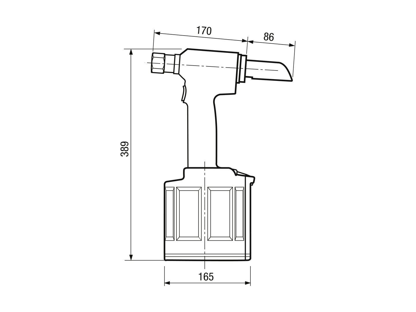 DescriptionProduct featuresFor Avdelok® 5 - 9,7 mm and Monobolt® 10 mm Weight (without equipment): 4,9 kg Stroke: 21 mm Pulling force: 28500 N (at 5,5 bar) Working air pressure: max. 7 bar Air consumption each rivet: 2,4 lVariants