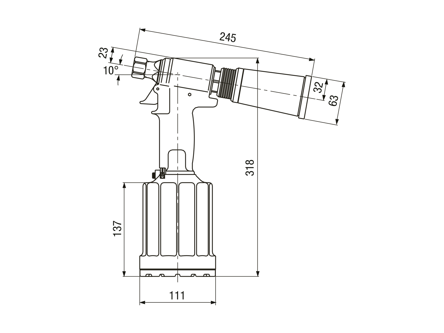 DescriptionProduct featuresFor rivet-Ø: 4,8-6,4 Weight: 2,6 kg Stroke: 17 mm Pulling force: 19 kN Working air pressure: max. 7 bar Air consumption each rivet: 1,3 lVariants