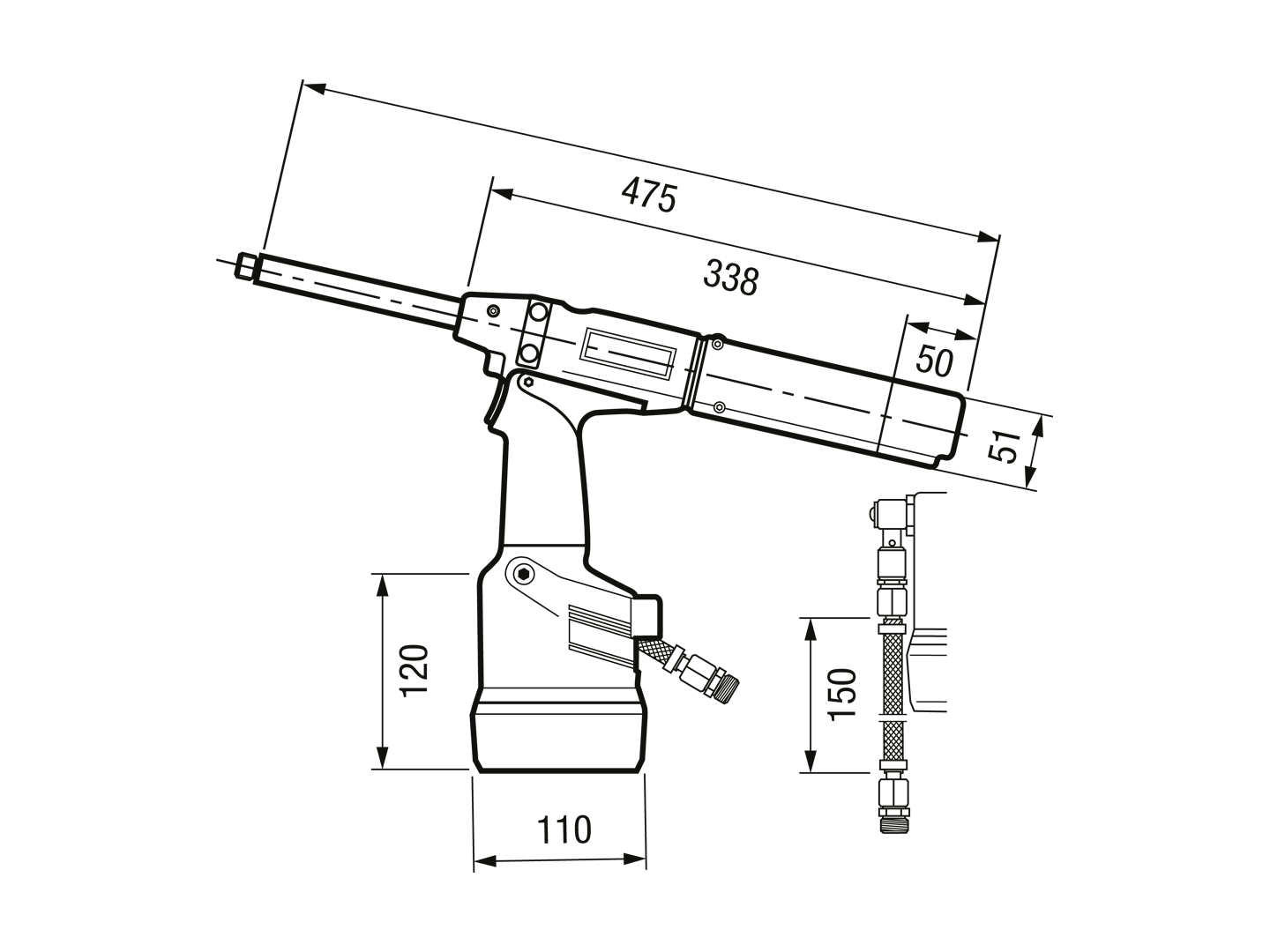 DescriptionProduct featuresFor rivet-Ø: 2,4-6 Weight 2,2 kg Stroke: 30 mm Cycle time (approx.): 1 second Operating pressure 5-7 bar Air consumption 2,6 l free air / cycleVariants