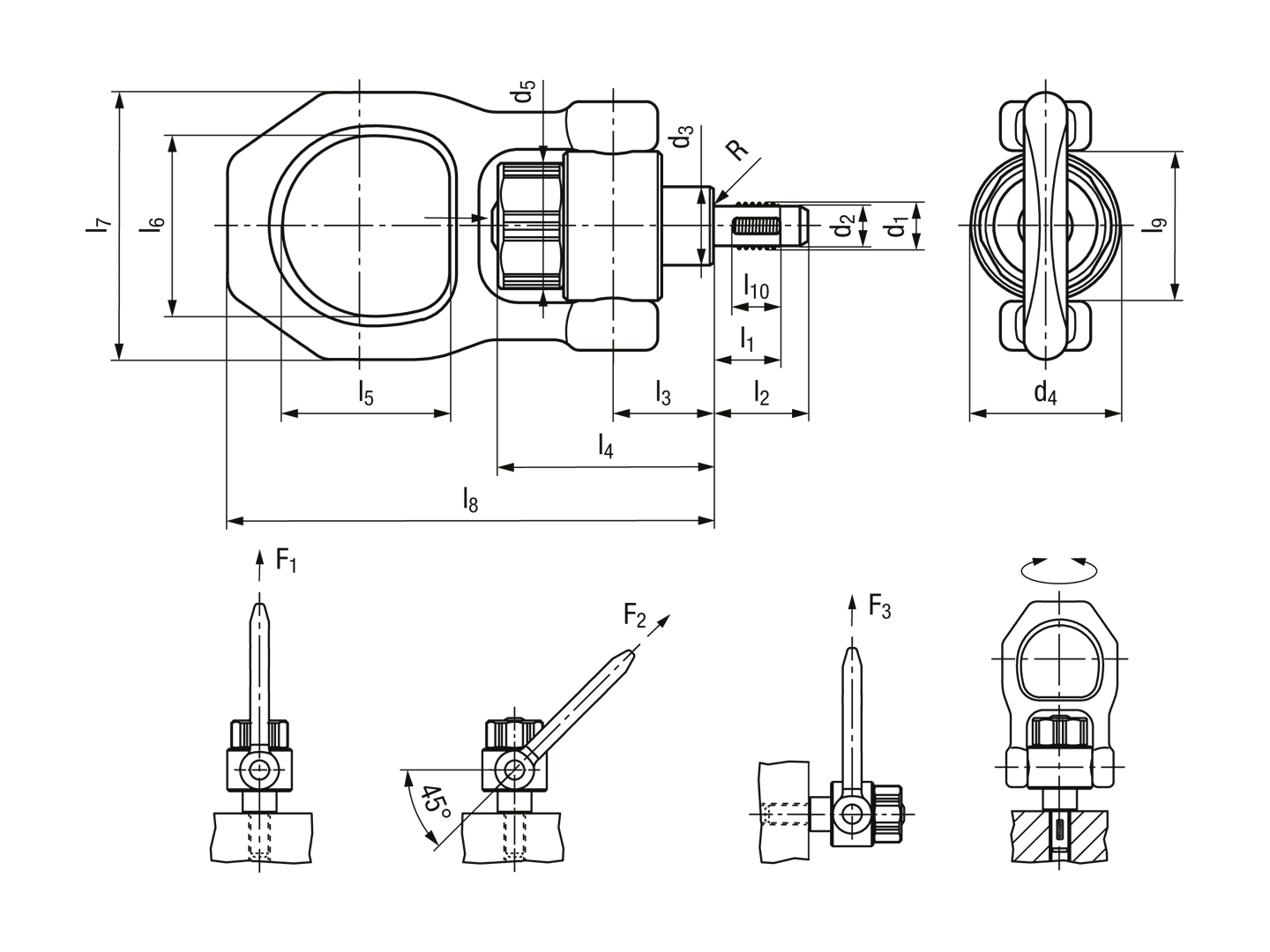 Threaded lifting pins with rotating shackle are designed to lift and hold point loads. Threaded lifting pins with rotating shackle are not suited for the rotation of the load or for passenger transportation! The rotating shackle aligns itself optimally in the direction of force.
