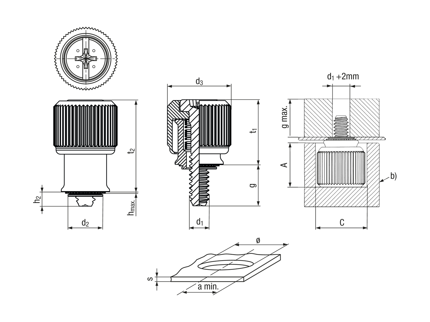 DescriptionProduct featuresKnurled knob: aluminium, black anodize Retainer: steel hardened, nickel plated Screw: stainless steel AISI 400, black nitride Spring: stainless steel AISI 300 For use in sheet hardness max. HRB 80Variants