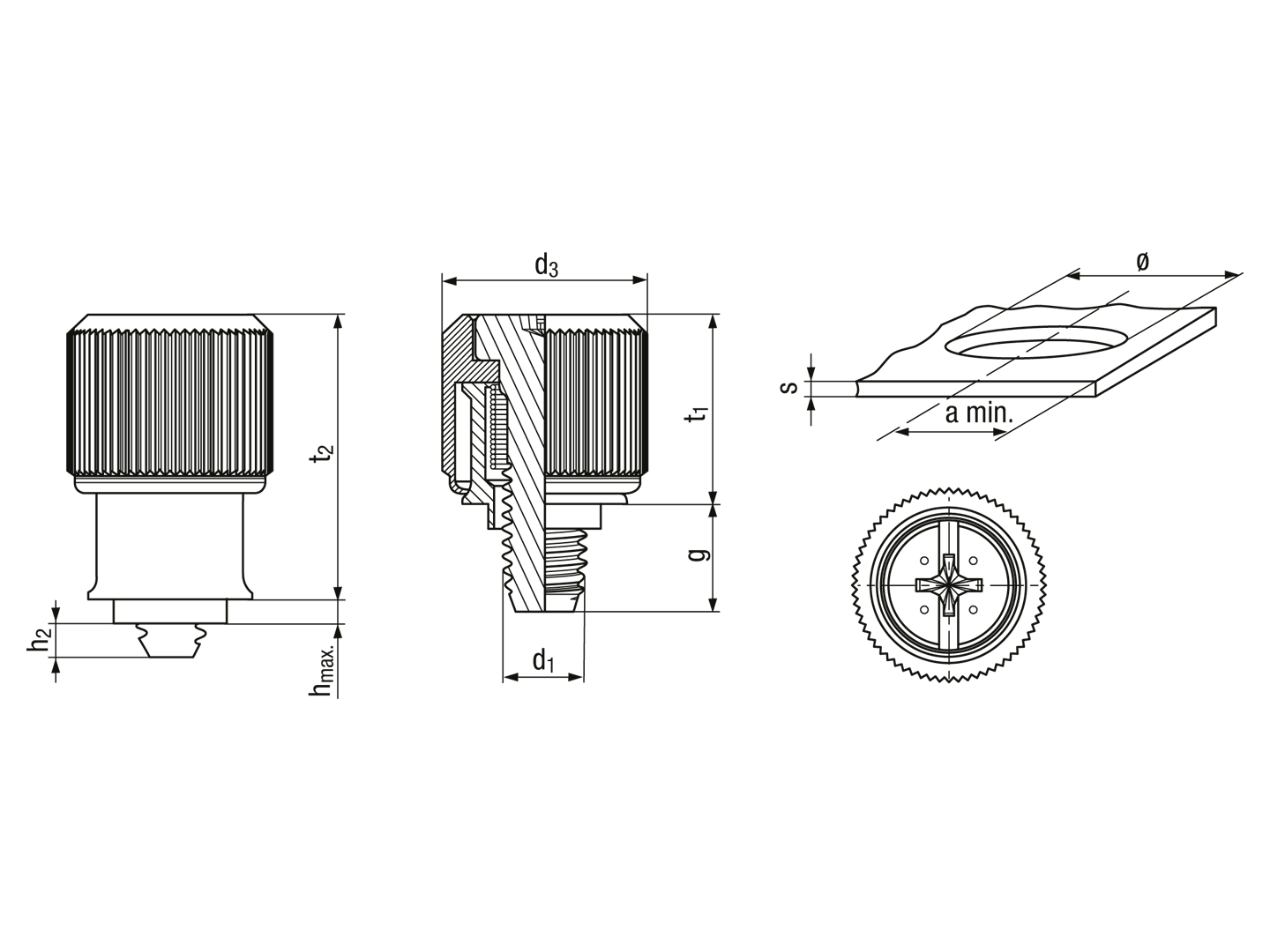DescriptionProduct featuresKnurled knob: aluminum Retainer: steel hardened Screw: stainless steel AISI 400 Spring: stainless steel AISI 300 For use in sheet hardness max. HRB 80VariantsCAD