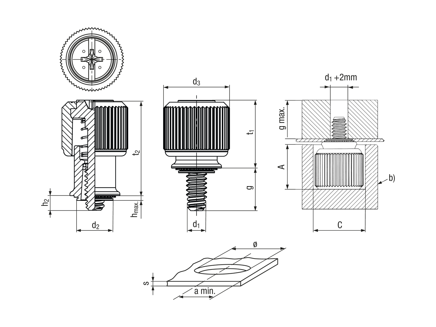 DescriptionProduct featuresKnurled knob: PC/ABS Retainer: steel hardened, nickel plated Screw: steel hardened, zinc plated Spring: stainless steel AISI 300 For use in sheet hardness max. HRB 80Variants