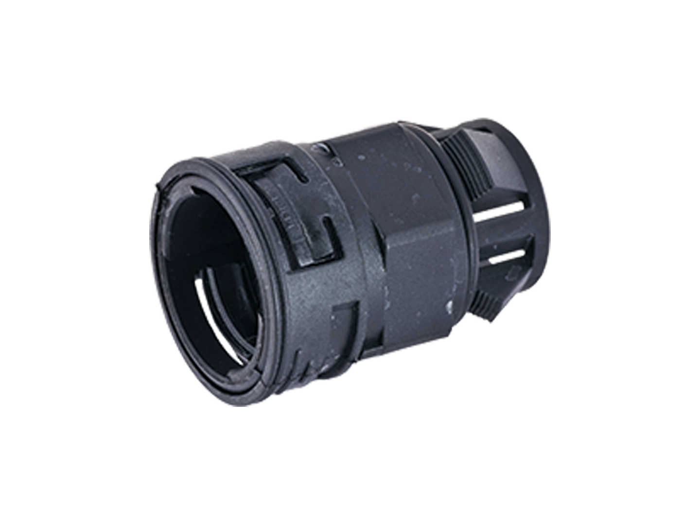 Just push in this tube connector into a hole which corresponds to the Pg or metric diameter. Female thread in the wall or lock nut is not necessary. Wall thickness area 1 – 2,5 mm.