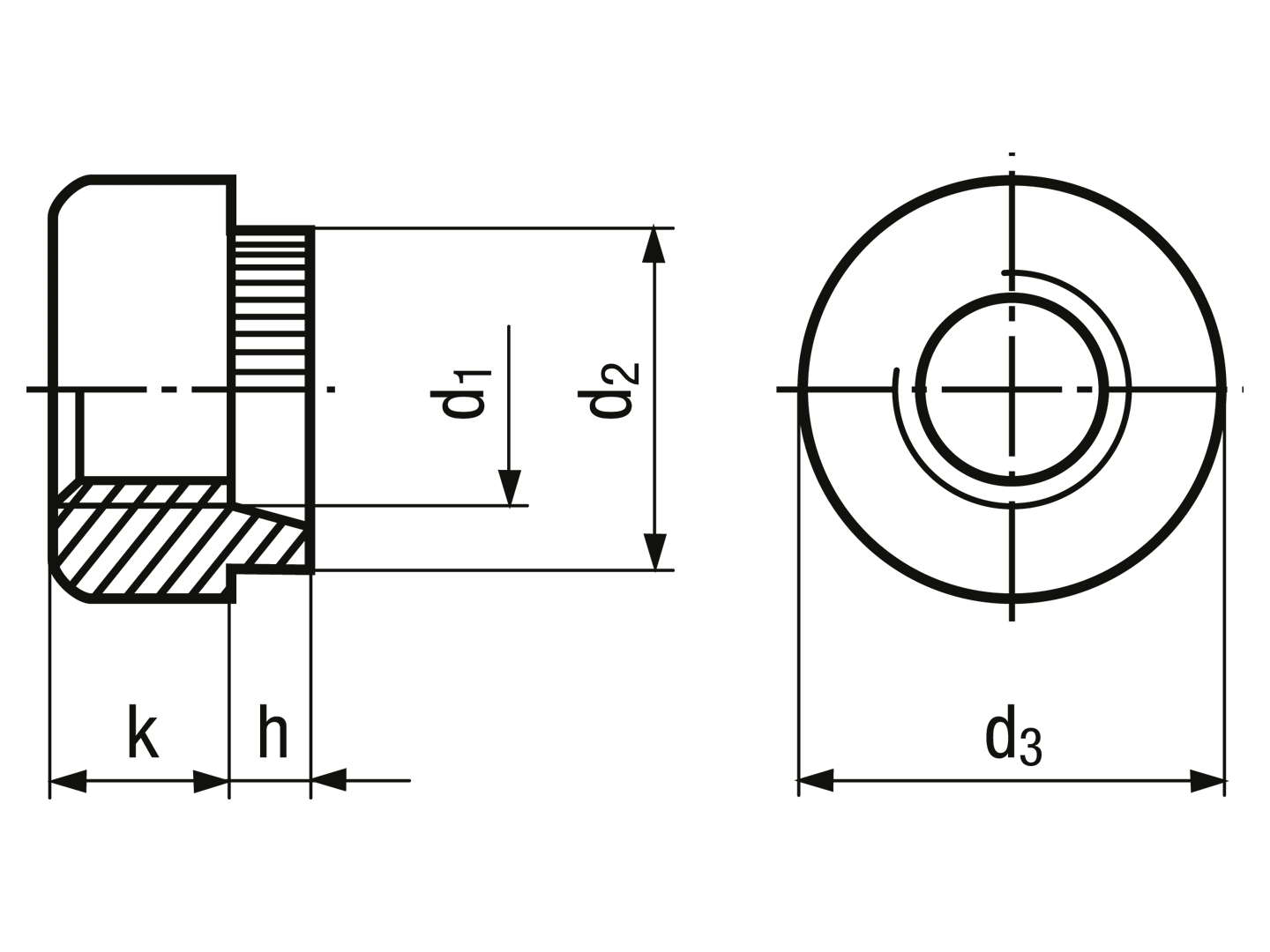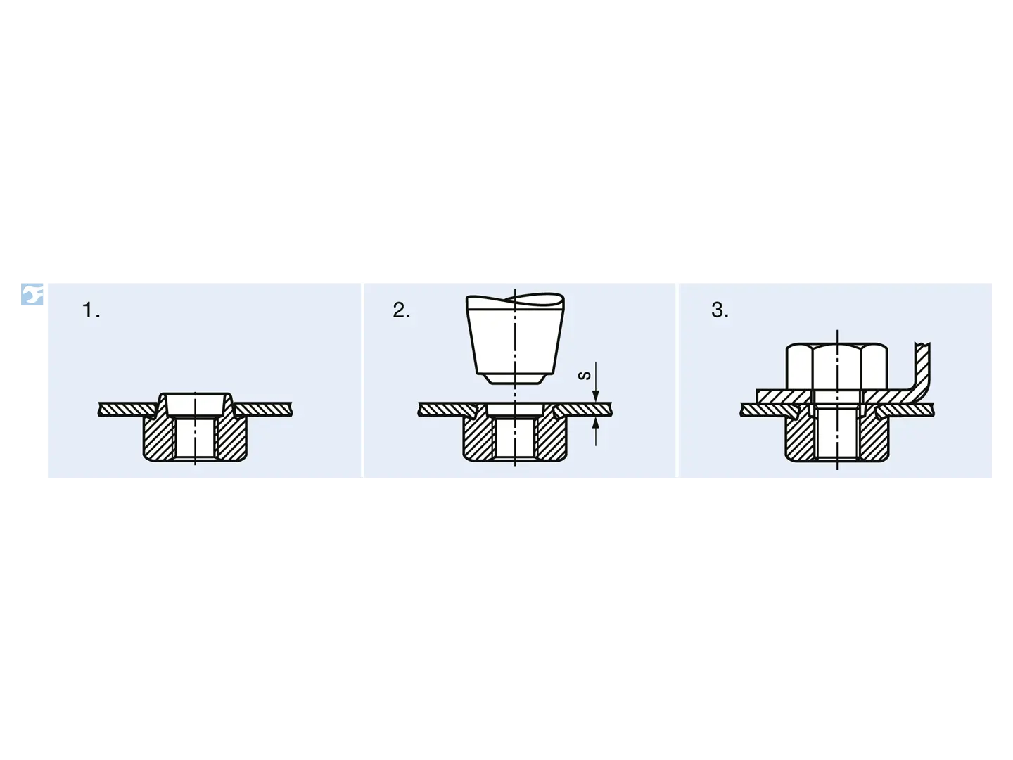 During riveting, the shaft is first expanded radially so that the knurling fully embeds into the hole wall. Then, the protruding flange edge is flanged over. Do not press in from the burr side of punched holes!