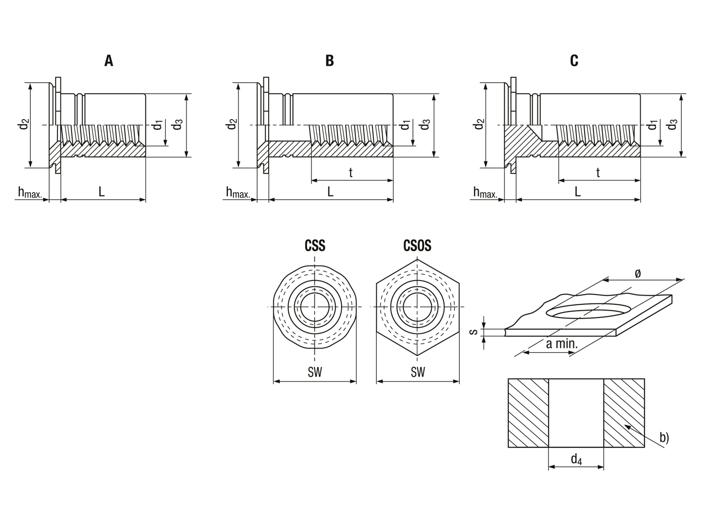 Self-clinching threaded standoffs for invisible installation, for metallic materials