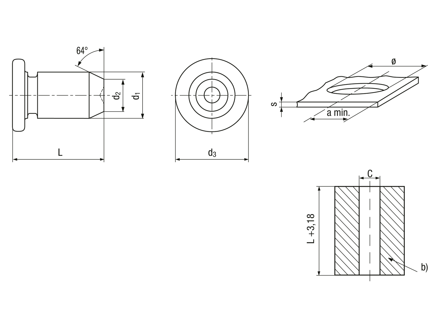 Miniatur self-clinching pins for stainless steel and metallic materials