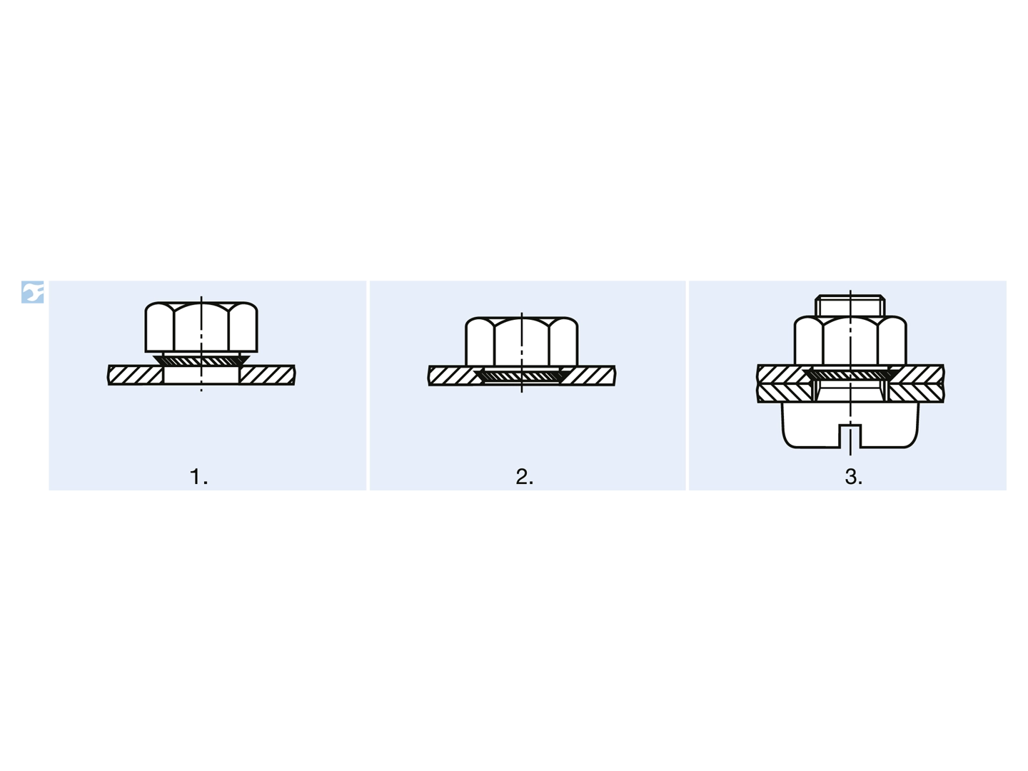 1. Centering the nut over the drilled or punched bore. 2. Press in the nut by using either a hammer or a rotating punch. 3. Fasten the screw from the opposite side.