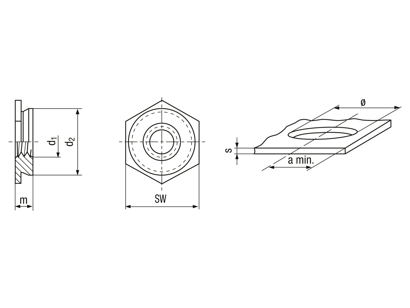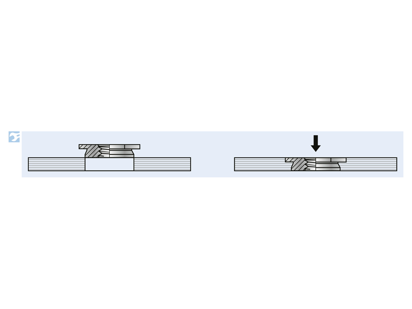 For sheet metal with max. hardness HRB 70. We recommend dimension M3 for new constructions. Especially for thin aluminum sheets. After installation, neither the top nor bottom protrude.