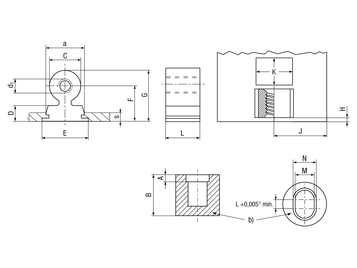 Self-clinching right-angle fasteners with UNC thread, for metallic materials