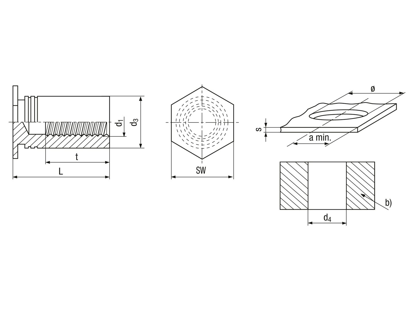 Self-clinching threaded standoffs closed type, for stainless steel and metallic materials