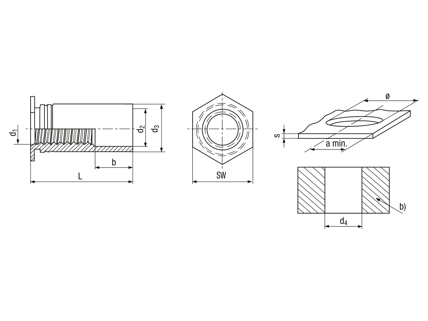 Self-clinching threaded standoffs open type, with UNC thread, for metallic materials