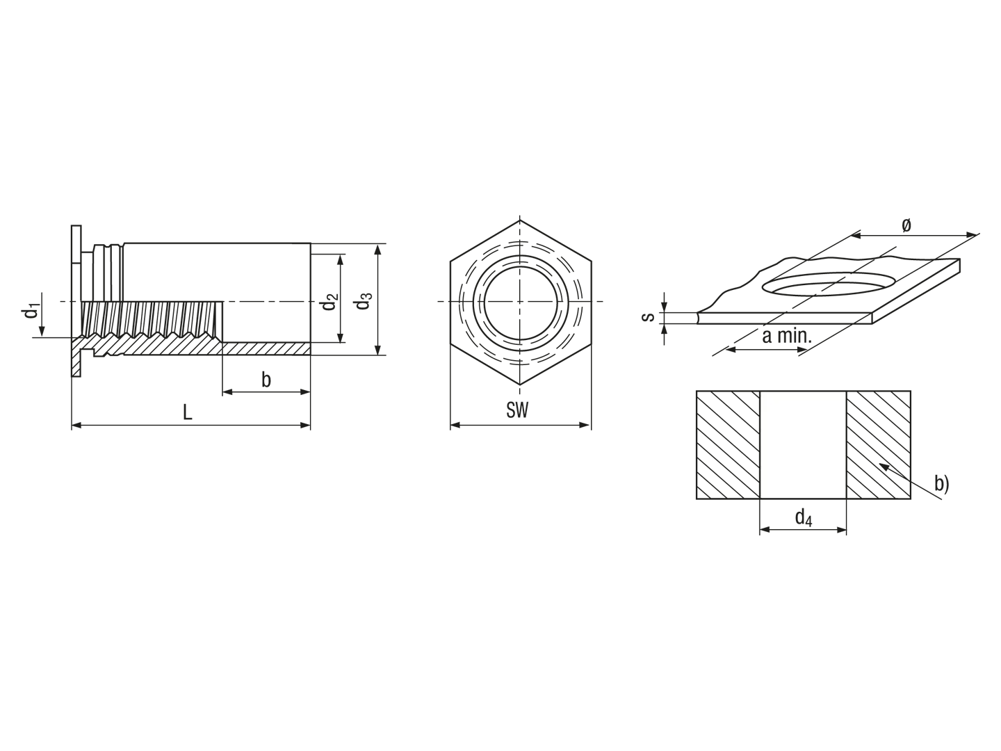 Self-clinching threaded standoffs open type, with UNC thread, for aluminum