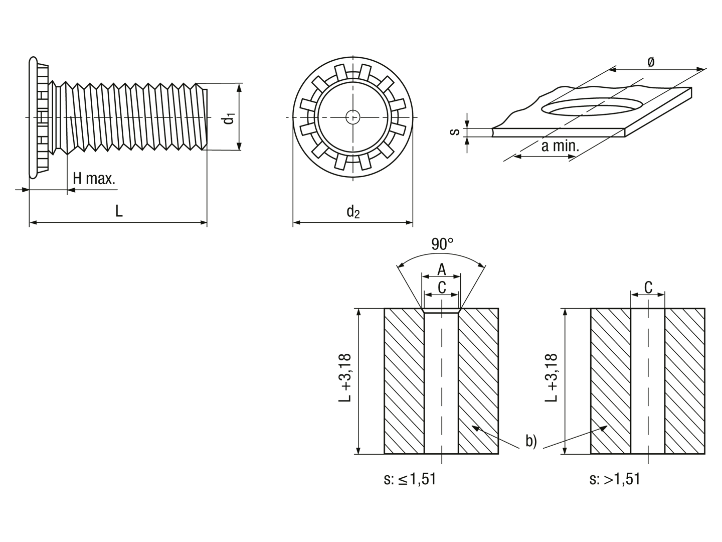 Self-clinching threaded studs for metallic materials