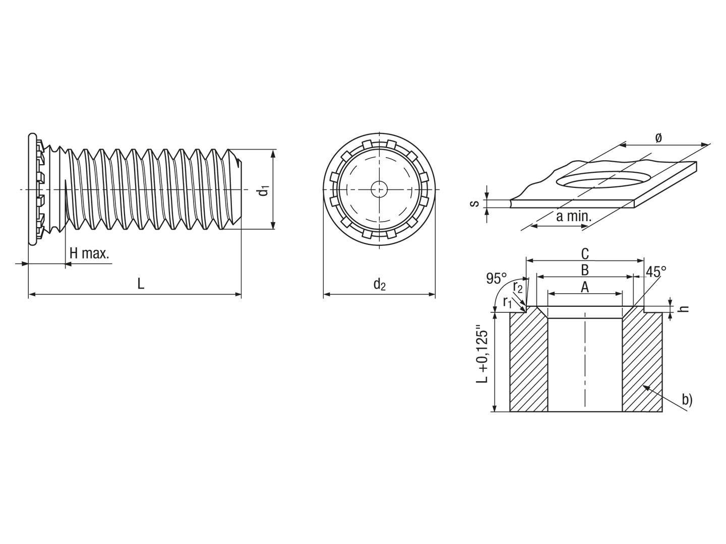 Self-clinching threaded studs with UNC thread, for stainless steel and metallic materials