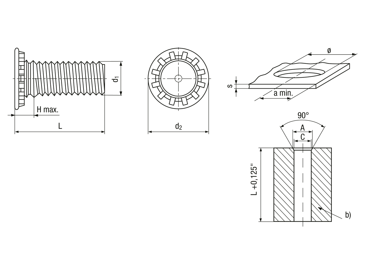 Self-clinching threaded studs with UNC thread, for metallic materials
