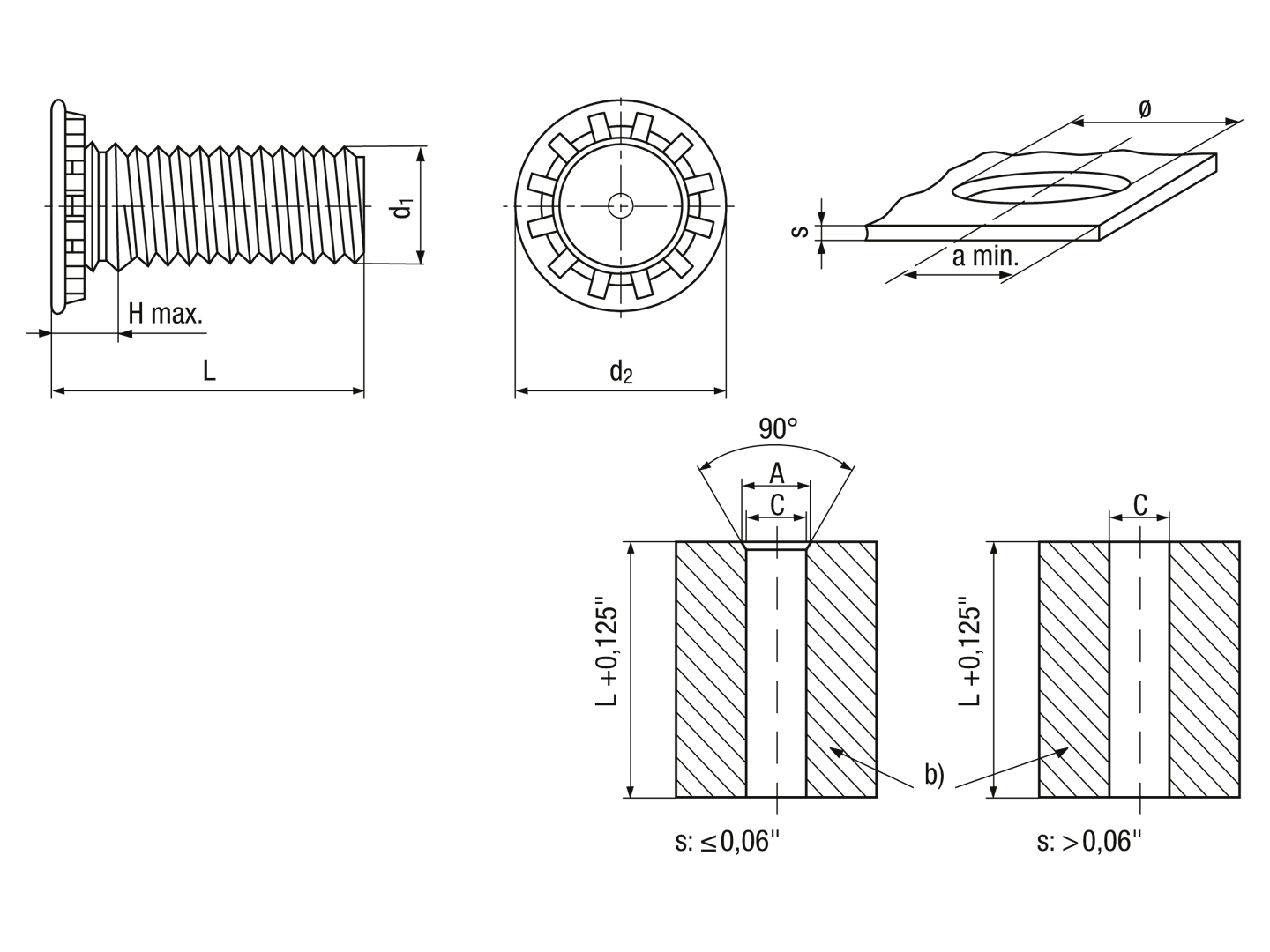 Self-clinching threaded studs with UNC thread, for metallic materials