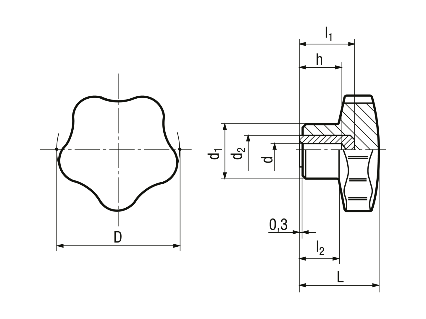 BN 14135ELESA® VC.192 - Lobe knobs with metal boss black-oxide steel boss, plain blind hole