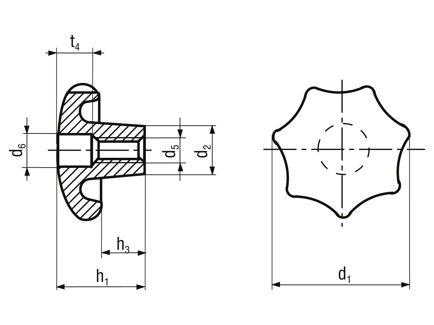 Star knobs nodular cast iron, deburred and sandblasted DIN 6336 D with tapped through-hole