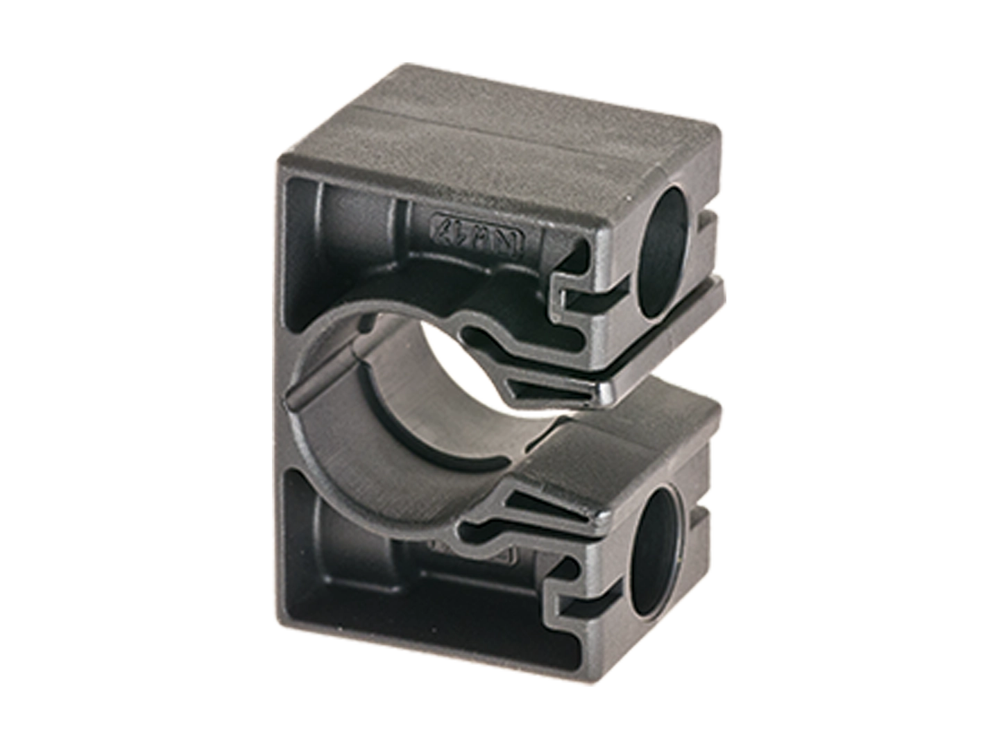These system supports can be mounted with two screws, so that a robust, anti-rotating conduit support is reached. Furthermore these parts are designed in such a way to enable the assembly on a support rail for size to size stack up.