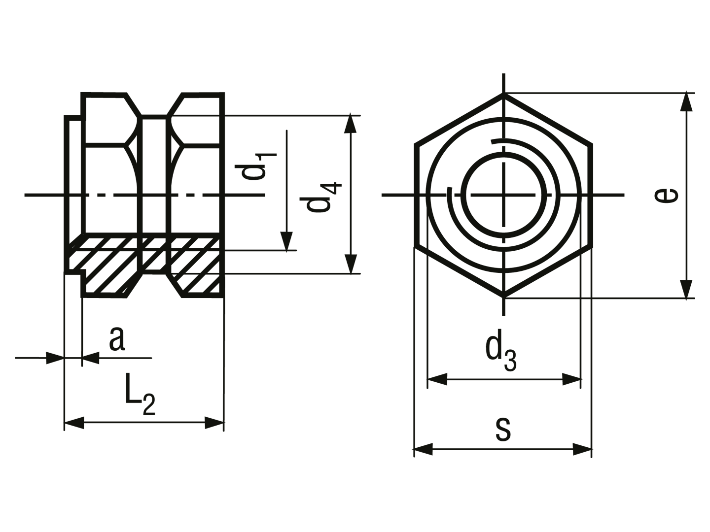BN 1035C - Threaded inserts for insertion form C hexagonal with shoulder, with through hole thread, for thermoplastics and thermosets