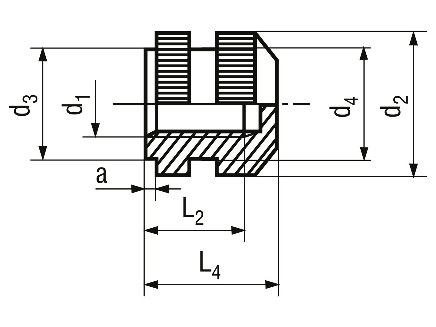 S - Threaded inserts for insertion form S knurled with shoulder, with threaded blind hole, for thermoplastics and thermosets