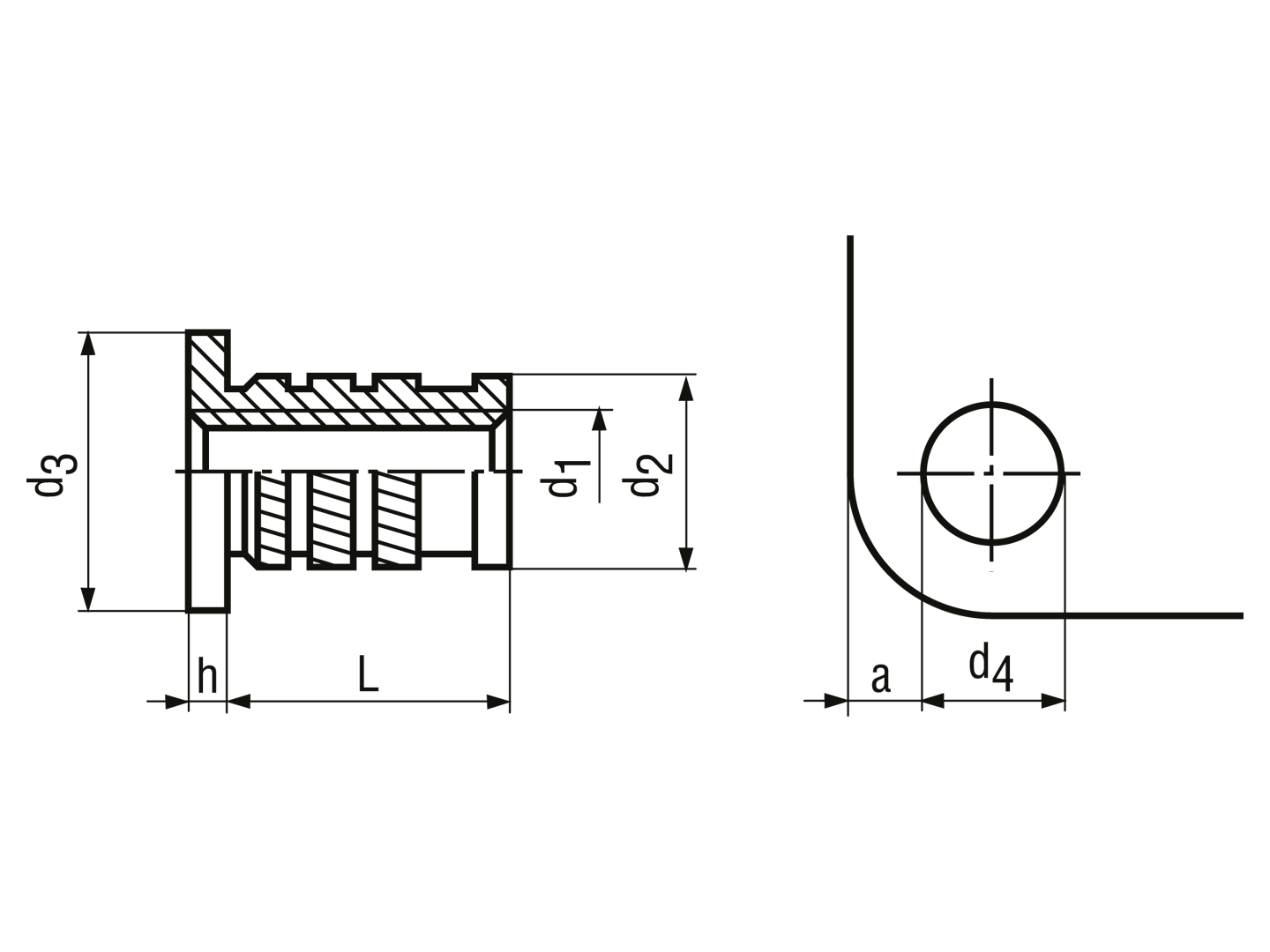 Press-in threaded inserts with small head, for thermoplastics and thermosets