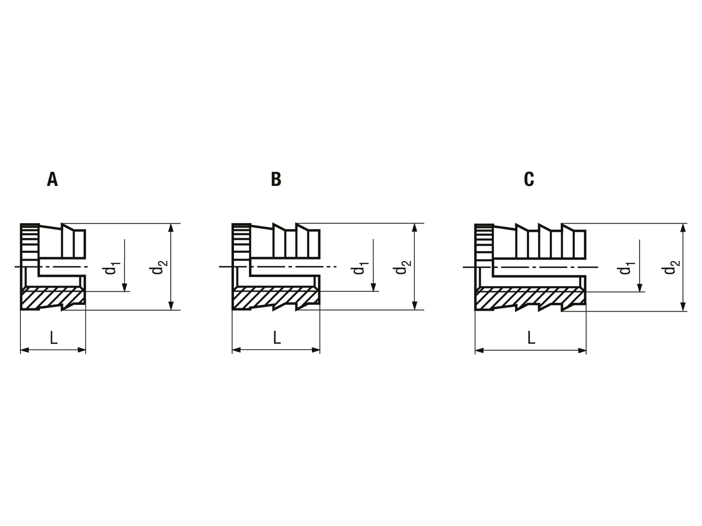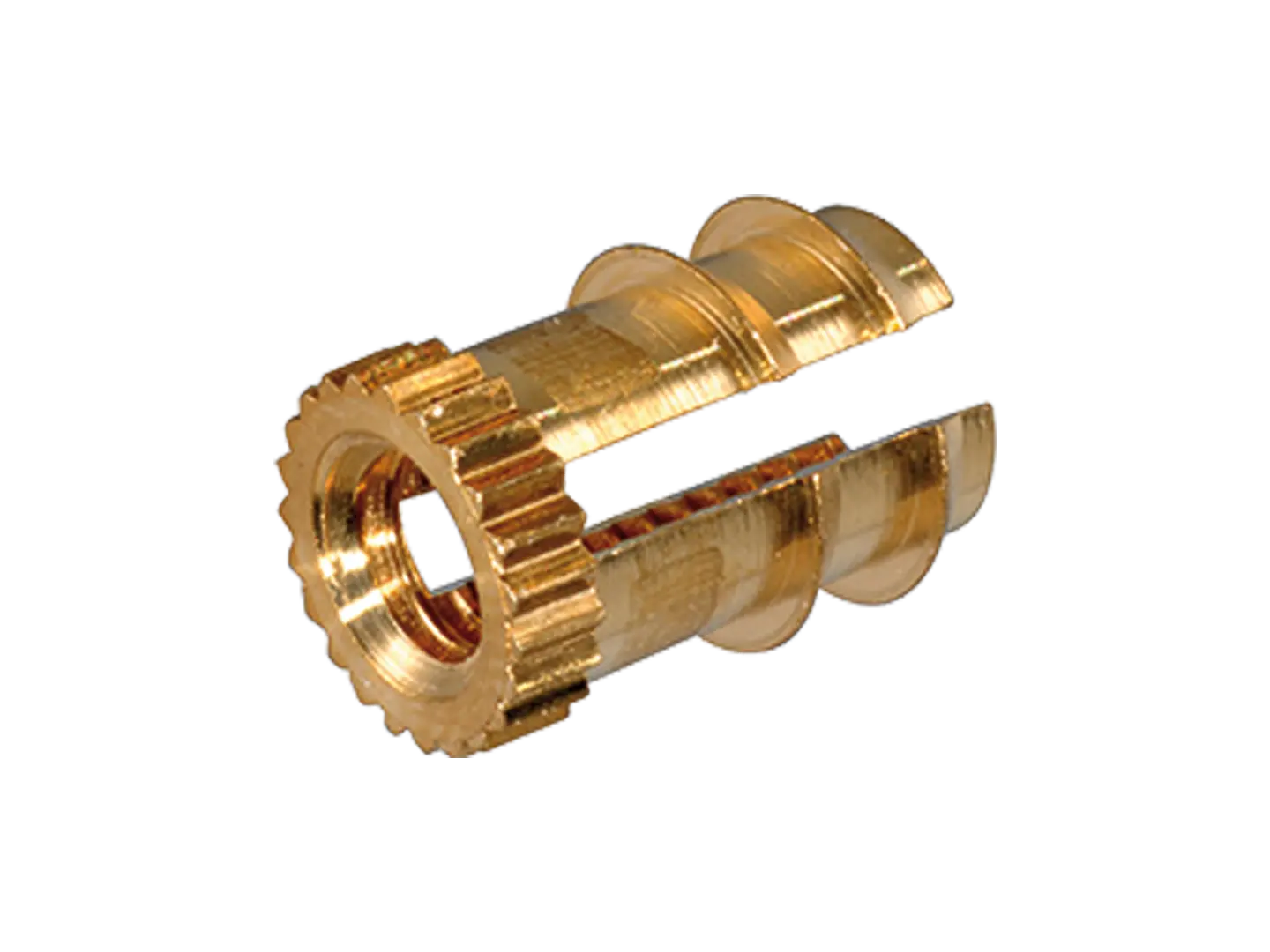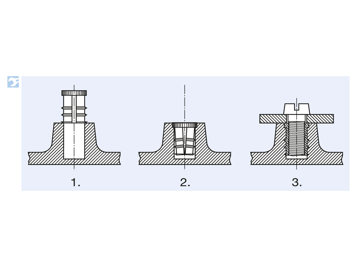 BancLok® F 821/822/823 - Press-in threaded inserts with expansion anchoring without head, with gear rim and anchoring profile, for wood, soft plastics and composite materials