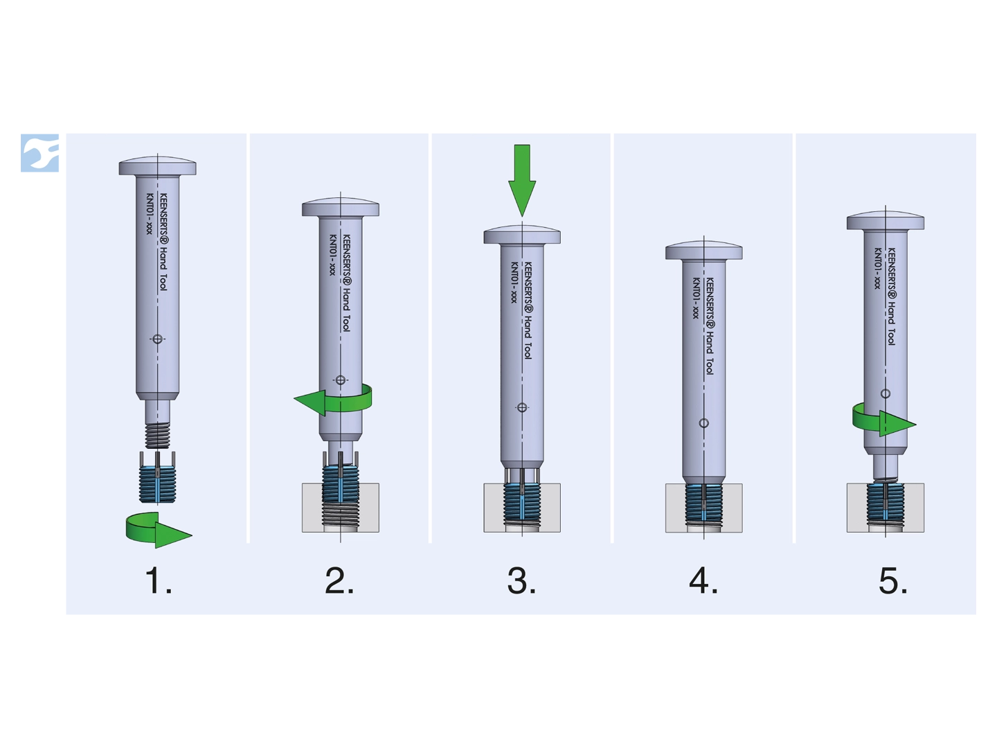 1. Screw the KEENSERTS® inserts onto the threaded pin of the KNT – Tool.