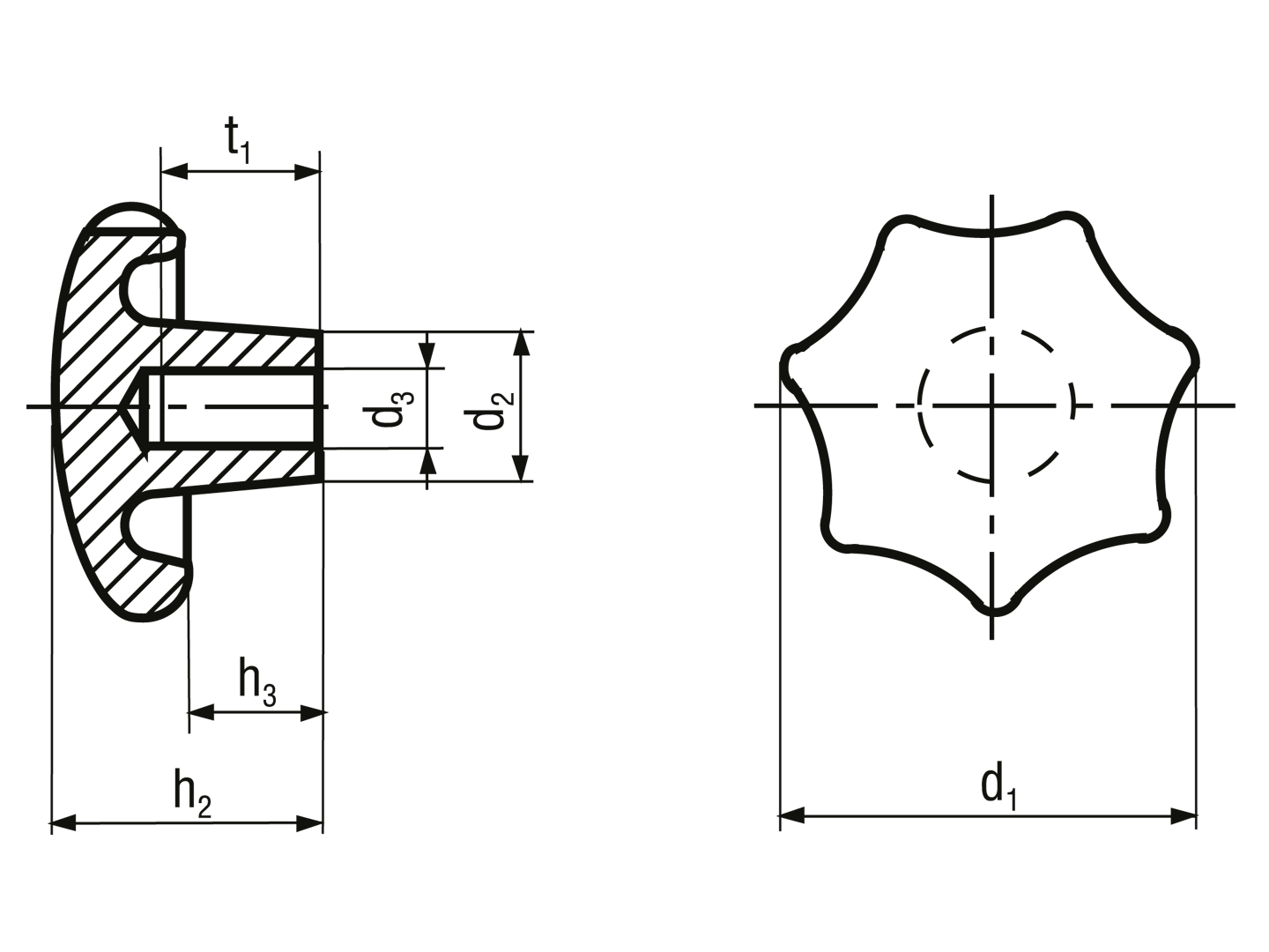 凸轮式旋钮 球墨铸铁,去毛刺磨砂表面 DIN 6336 E 带螺纹盲孔